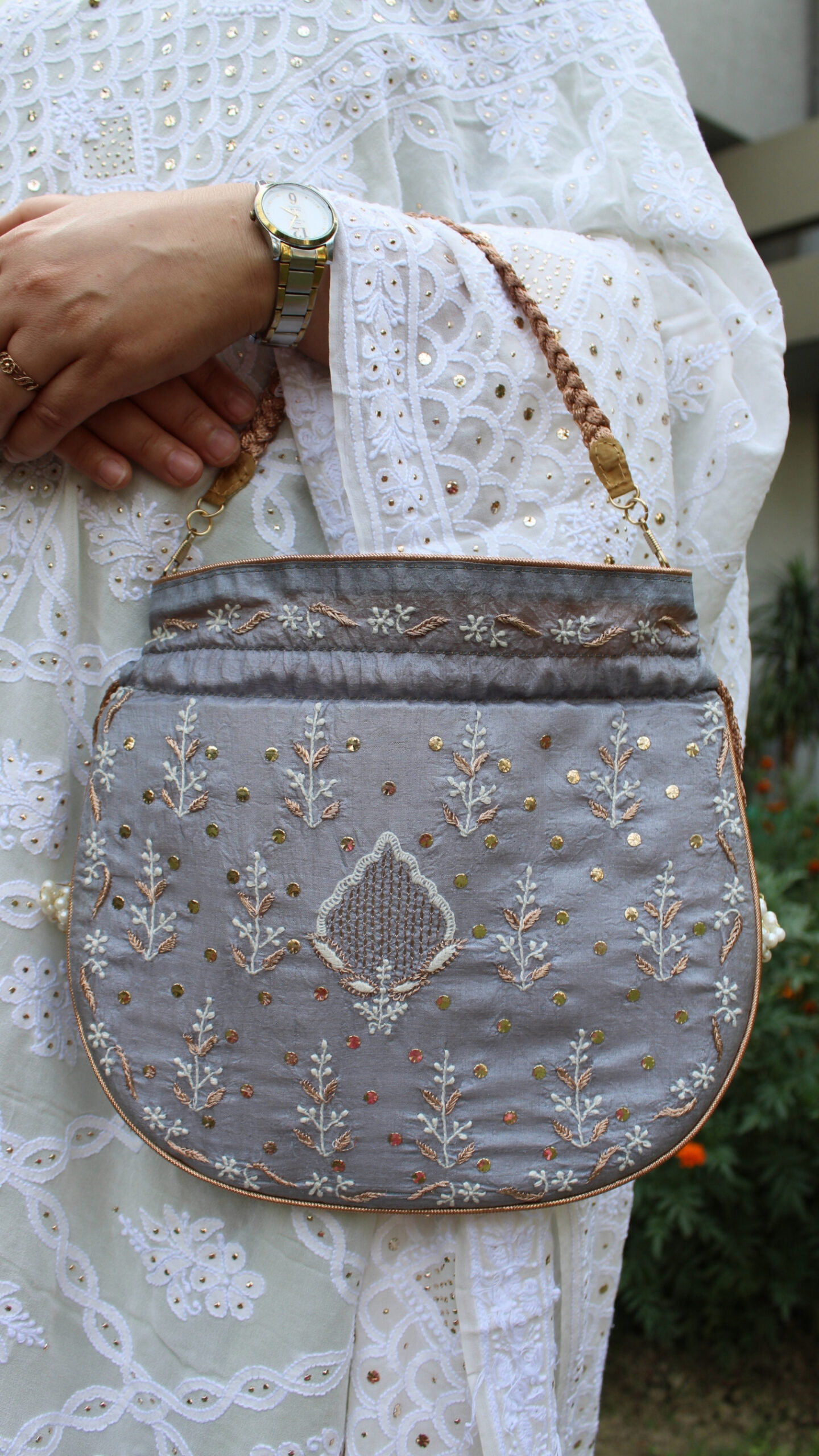 Elevate your style with this Ash Grey Chikankari & Mukaish Batua, a perfect blend of subtle elegance and tradition. Intricately handcrafted with fine Chikankari embroidery, it showcases the beauty of authentic Lucknowi craftsmanship. The delicate Mukaish work adds a soft shimmer, enhancing the sophisticated ash grey hue. Designed to be compact yet functional, it easily holds your everyday essentials. Ideal for festive occasions, weddings, or elegant evening outings, it complements both ethnic and fusion looks. A timeless accessory that also makes for a refined gifting choice.