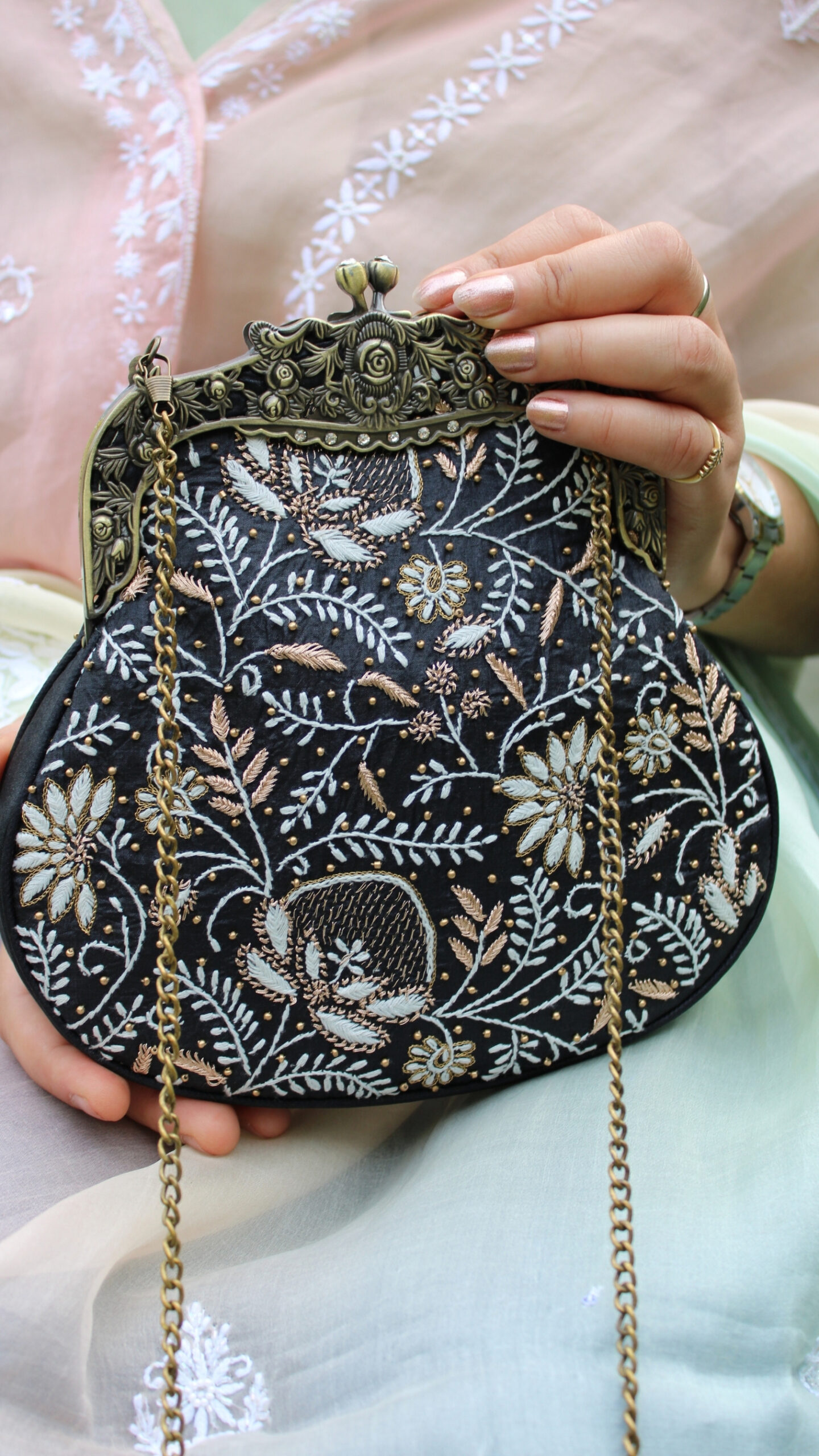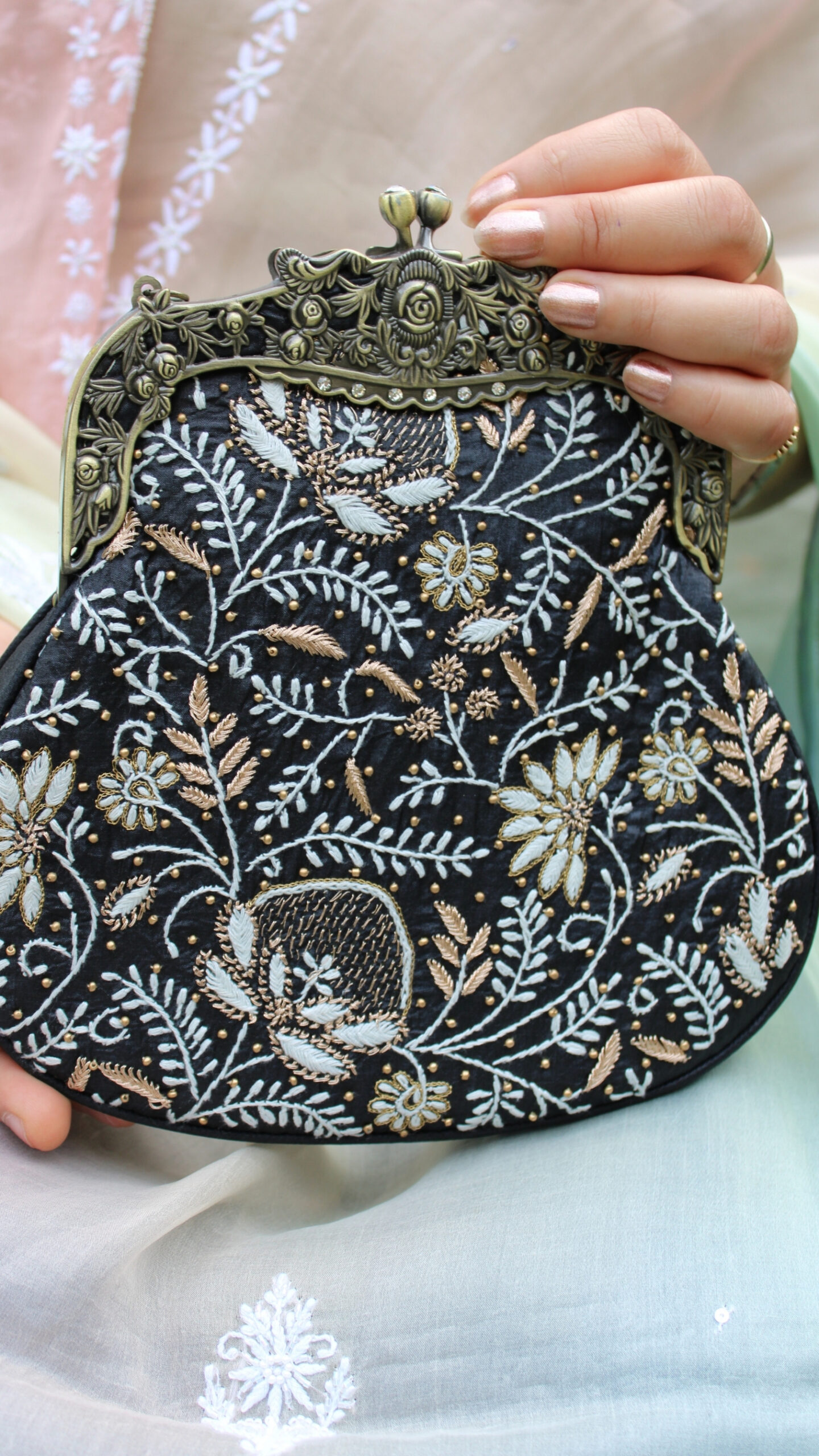 Subtle and elegant, this black Chikankari clutch exudes timeless charm.Featuring delicate hand-embroidered Chikankari work, it showcases authentic Lucknowi craftsmanship.The black tone offers a neutral, versatile appeal for any outfit.Crafted from premium fabric, it ensures durability with a refined finish.Its sleek and compact design makes it perfect for carrying essentials effortlessly.Ideal for weddings, festive occasions, and day-to-evening styling.A graceful blend of tradition and modern sophistication.