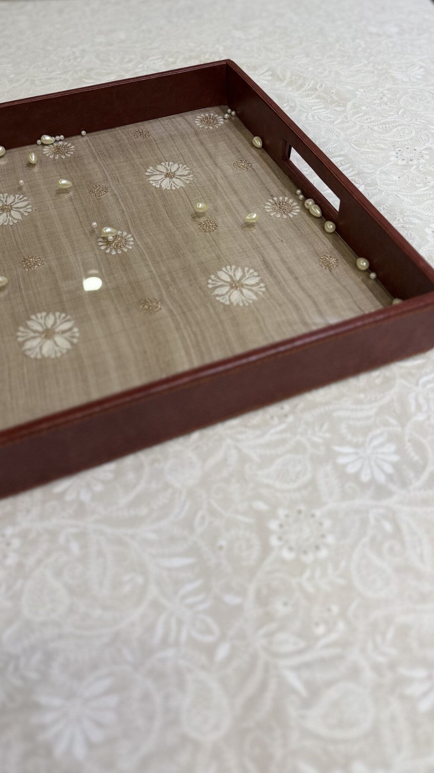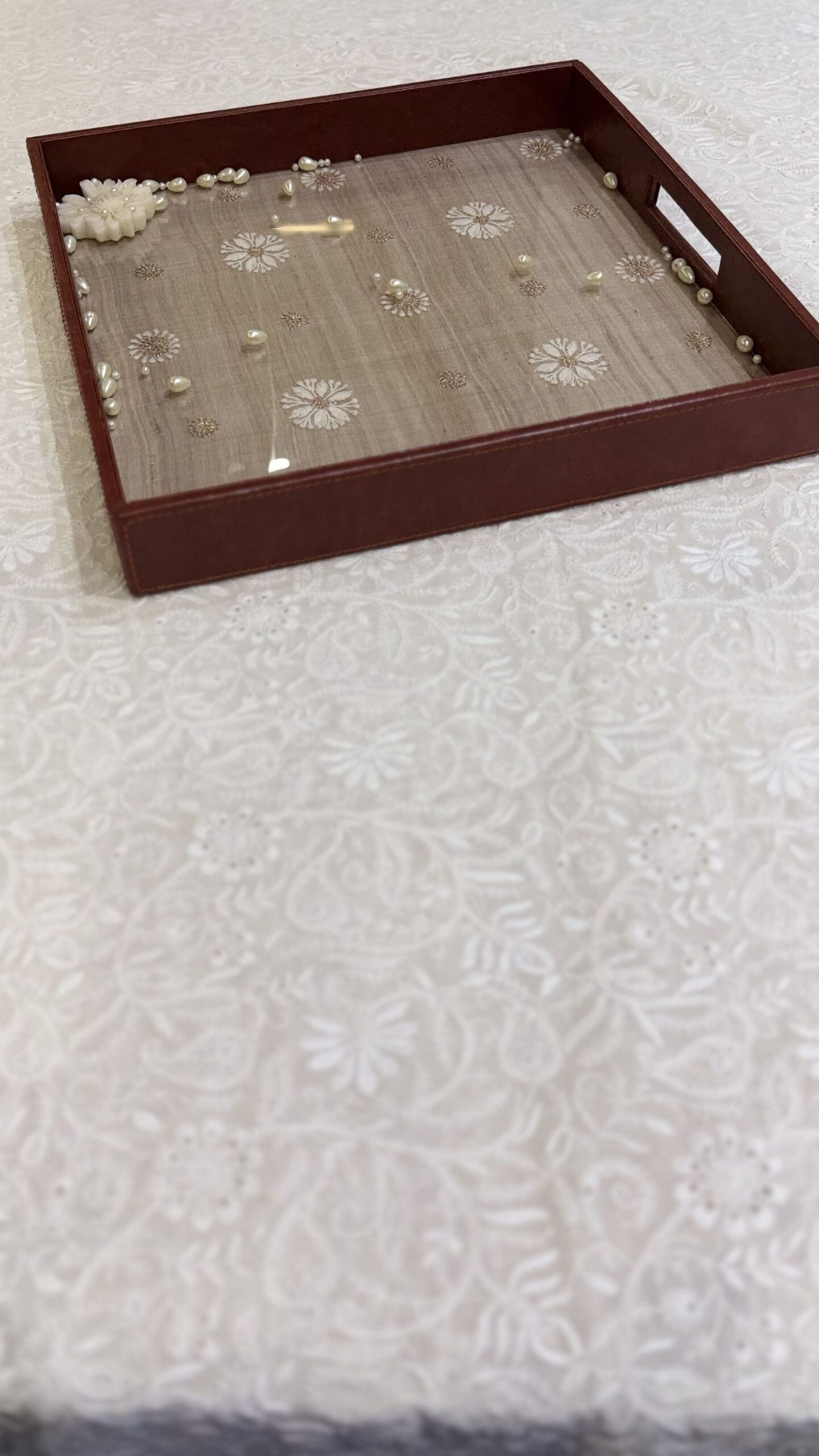 BEIGE CHIKANKARI LEATHER SQUARE TRAY