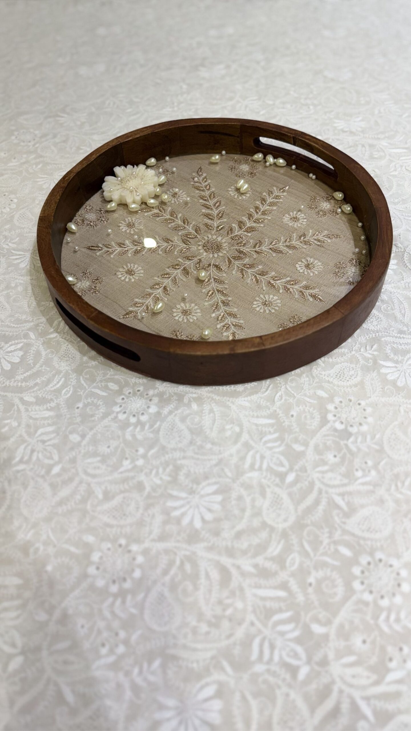 BEIGE CHIKANKARI WOODEN ROUND TRAY
