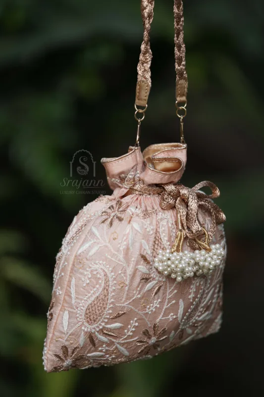 Silhouette: This beige/rust silk chikankari potli with hand embroidered and superior zari hand embellishments is everything you were searching for in an accessory. It has pearl tassels on a drawstring closure and Zari braided detachable handle makes it even dreamier. Add this with your traditional outfit to give it a nudge of chikankari work and lucknowi culture blended with trendy chic style.