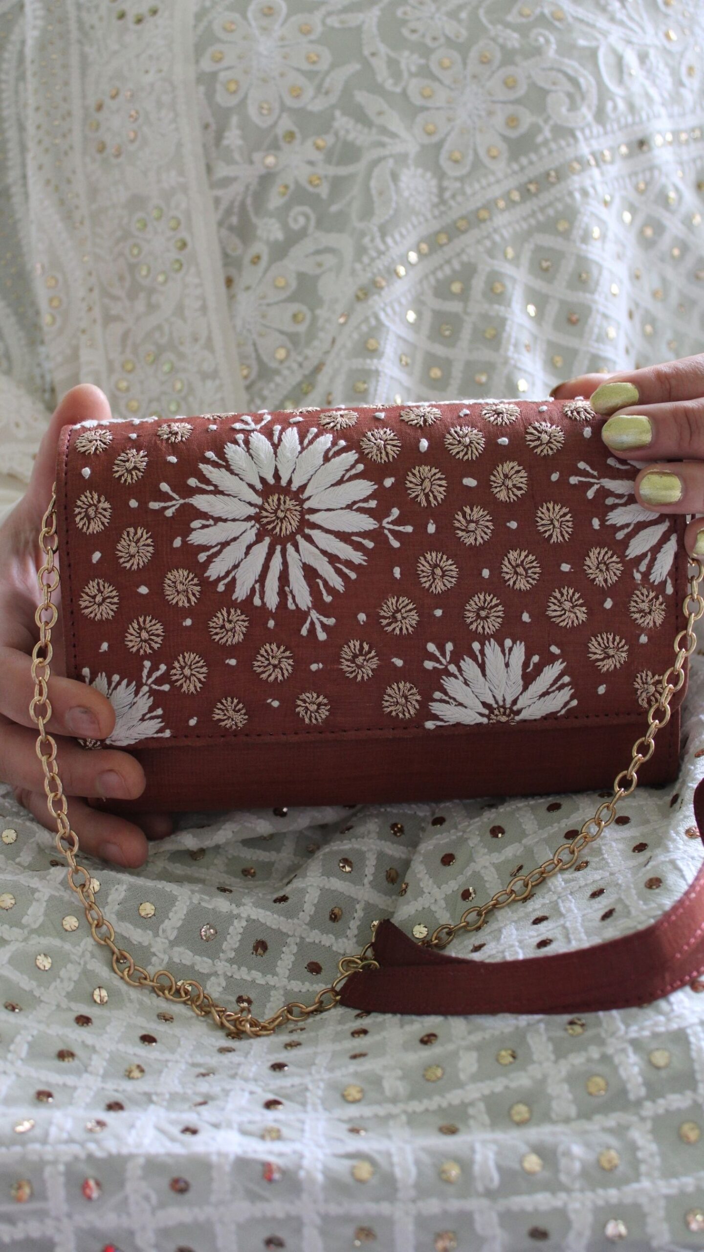 Add a rich and sophisticated touch to your ensemble with this Chocolate Brown Chikankari Clutch, crafted with timeless elegance. Featuring intricate Chikankari embroidery, it beautifully reflects the charm of traditional Lucknowi craftsmanship. The deep chocolate brown hue lends a warm, luxurious appeal, perfect for both day and evening occasions. Compact yet spacious, it is designed to carry your essentials like phone, cash, and makeup with ease. Ideal for festive events, weddings, or casual outings, it complements both ethnic and fusion outfits effortlessly. A graceful accessory that also makes for a thoughtful gifting choice.