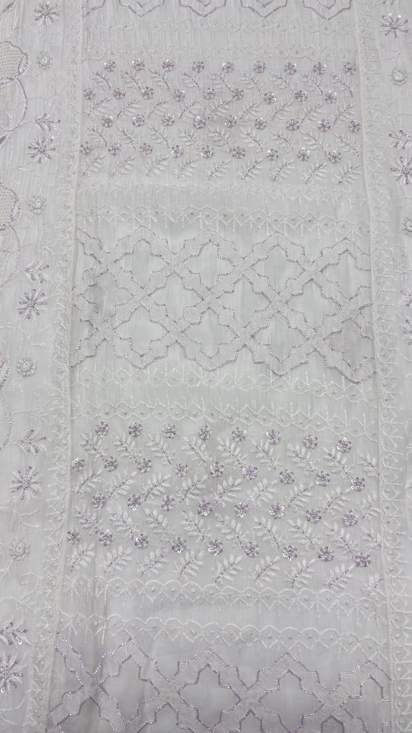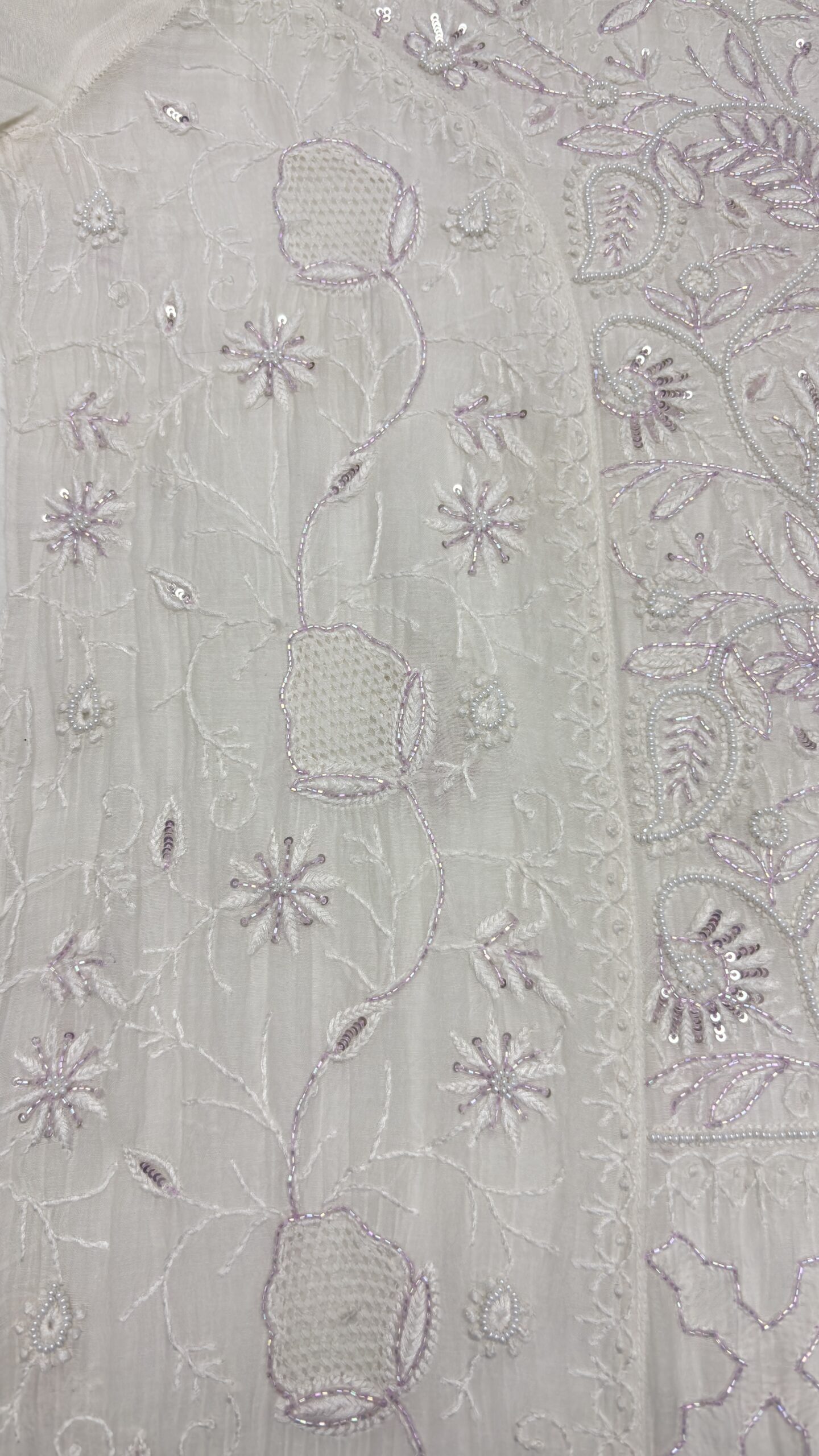 Intricate hand-done Chikankari embroidery enhances the ensemble with delicate heritage artistry.