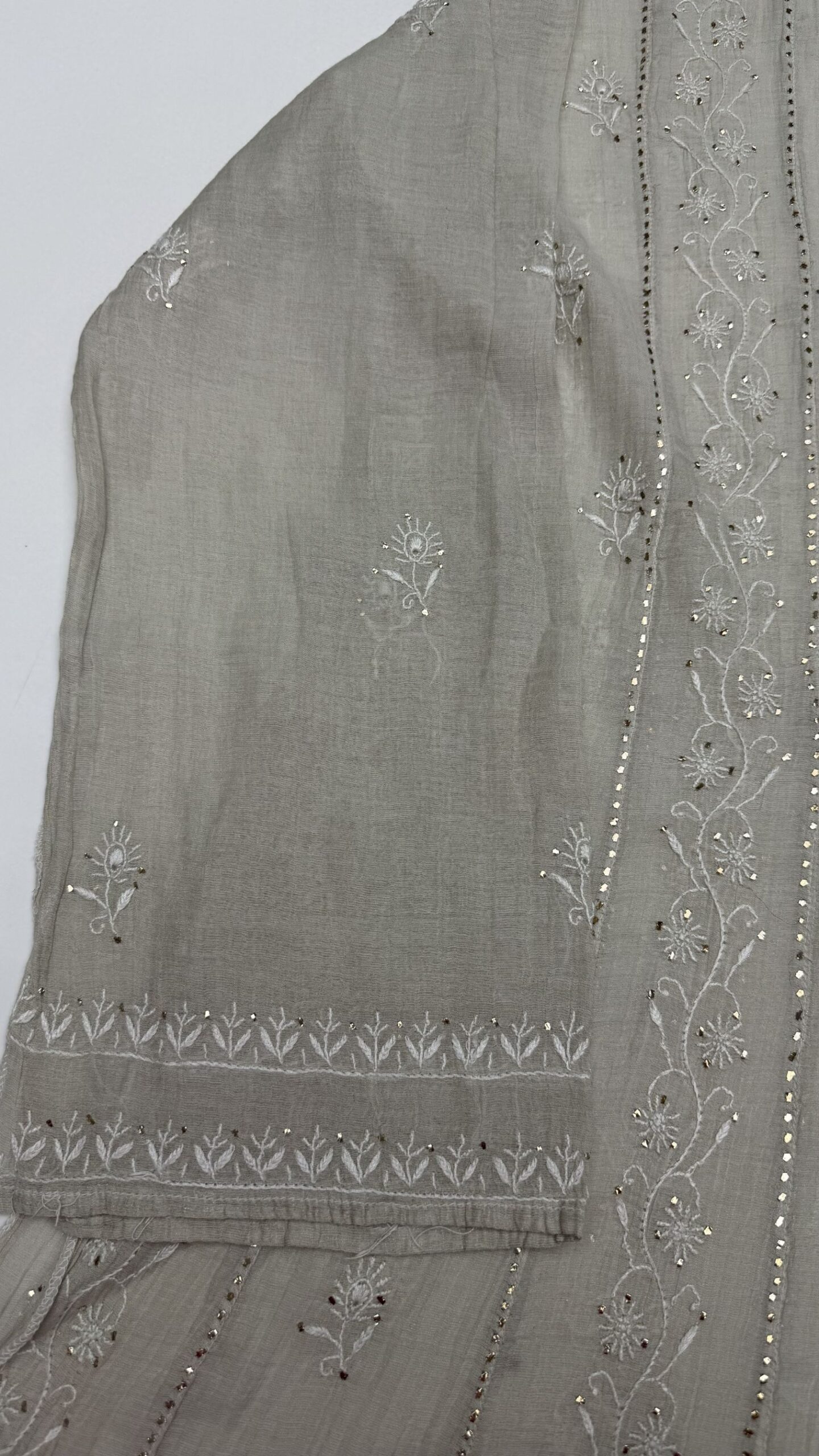 This dyeable pure premium silver tissue Chikankari Anarkali set exudes timeless elegance and versatility. Crafted from fine tissue fabric, it features a subtle sheen that enhances its luxurious appeal. The intricate Chikankari embroidery is beautifully complemented with delicate mukaish work, adding a hint of shimmer. Its dyeable nature allows you to customize the color as per your preference or occasion. Designed in a flowing Anarkali silhouette, it offers a graceful and flattering fit. Paired with a matching dupatta, the ensemble completes a refined and ethereal look. Perfect for festive wear, weddings, or bespoke styling, it embodies understated opulence.