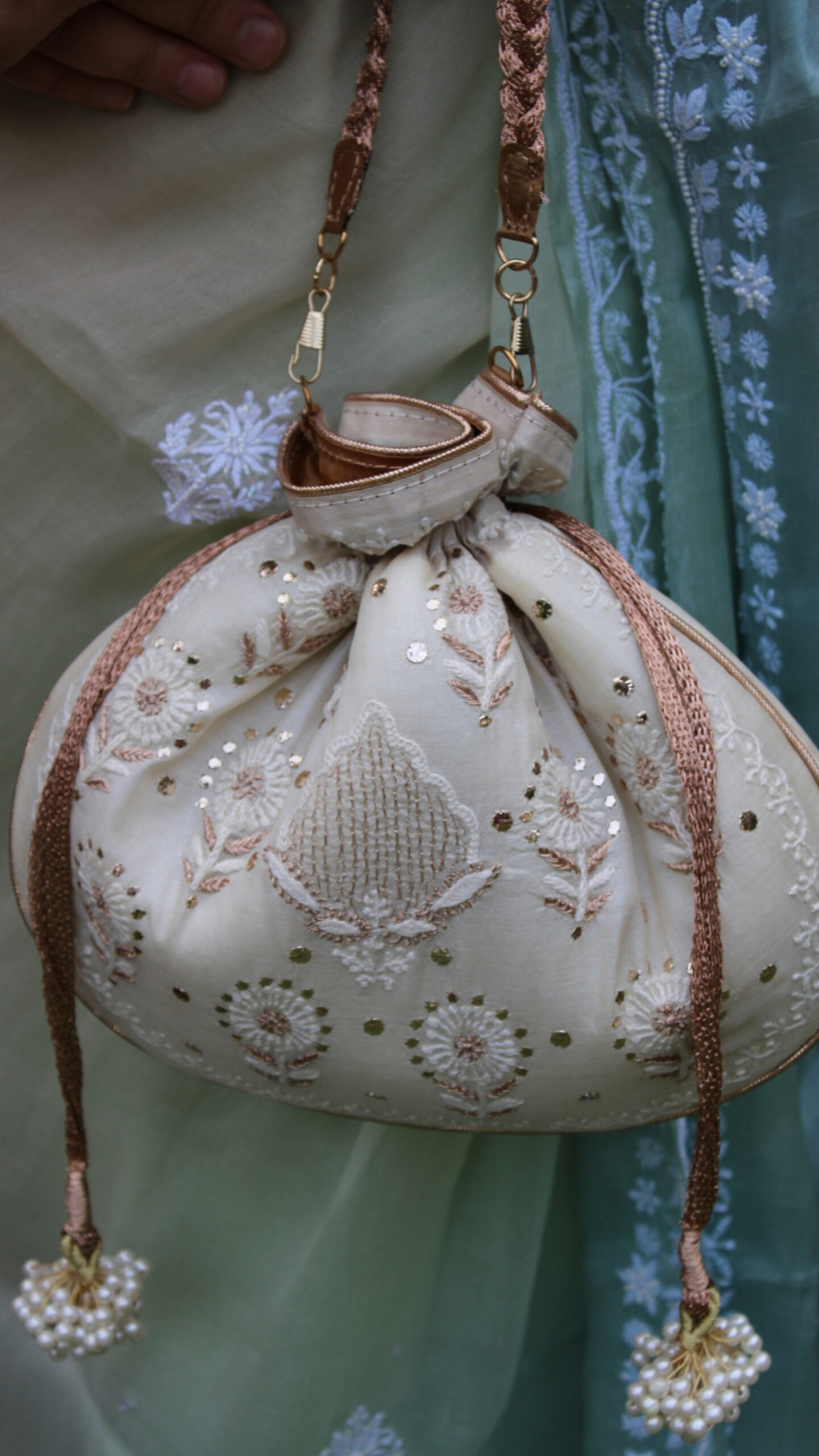 Embrace timeless elegance with this Ivory Chikankari & Mukaish Batua, beautifully crafted to reflect classic sophistication. Featuring intricate Chikankari embroidery, it highlights the finesse of traditional Lucknowi craftsmanship. The delicate Mukaish work adds a subtle shimmer, perfectly enhancing the serene ivory tone. Compact yet functional, it offers ample space to carry your essentials with ease. Ideal for weddings, festive occasions, or elegant gatherings, it complements every outfit effortlessly. A graceful accessory that also makes for a refined and thoughtful gift.