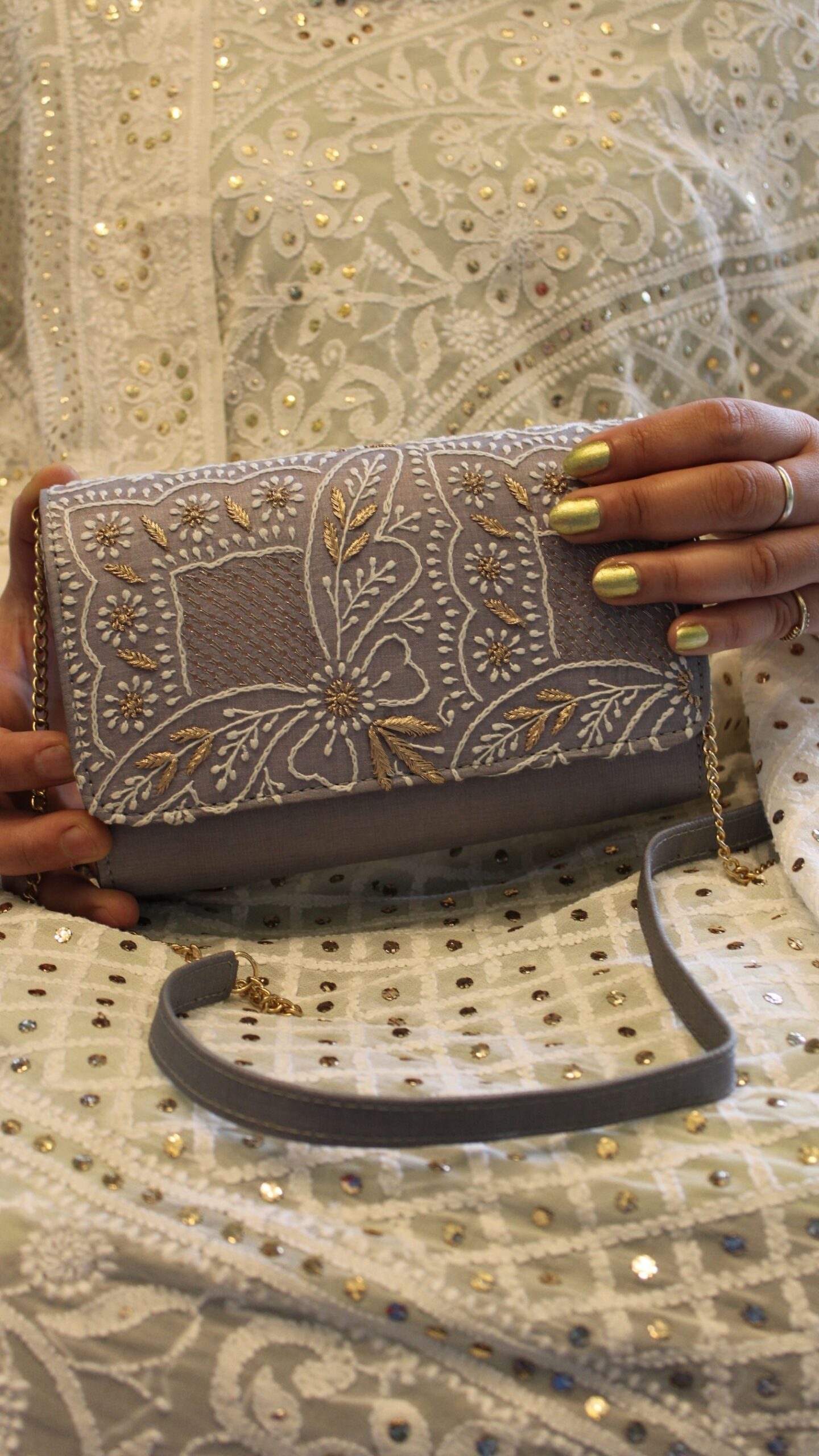 Elevate your style with this Koala Gray Chikankari Clutch, a perfect blend of modern elegance and traditional artistry. Adorned with intricate Chikankari embroidery, it beautifully showcases the finesse of Lucknowi craftsmanship. The sophisticated koala gray shade adds a contemporary charm, making it versatile for both day and evening occasions. Compact yet spacious, it is designed to carry your essentials like phone, cash, and makeup with ease. Ideal for festive events, weddings, or casual outings, it complements both ethnic and fusion looks effortlessly. A chic accessory that also makes for a stylish gifting option.