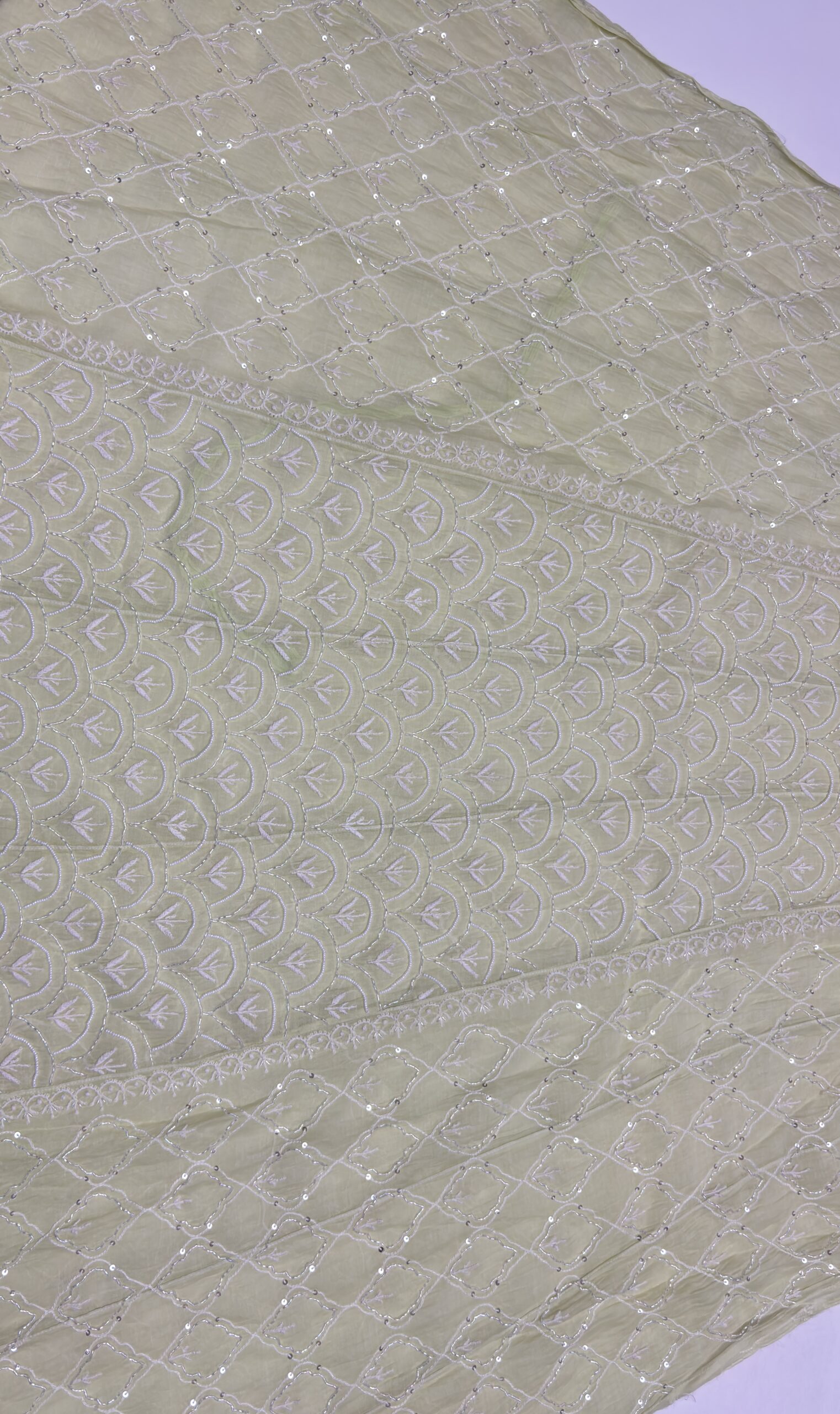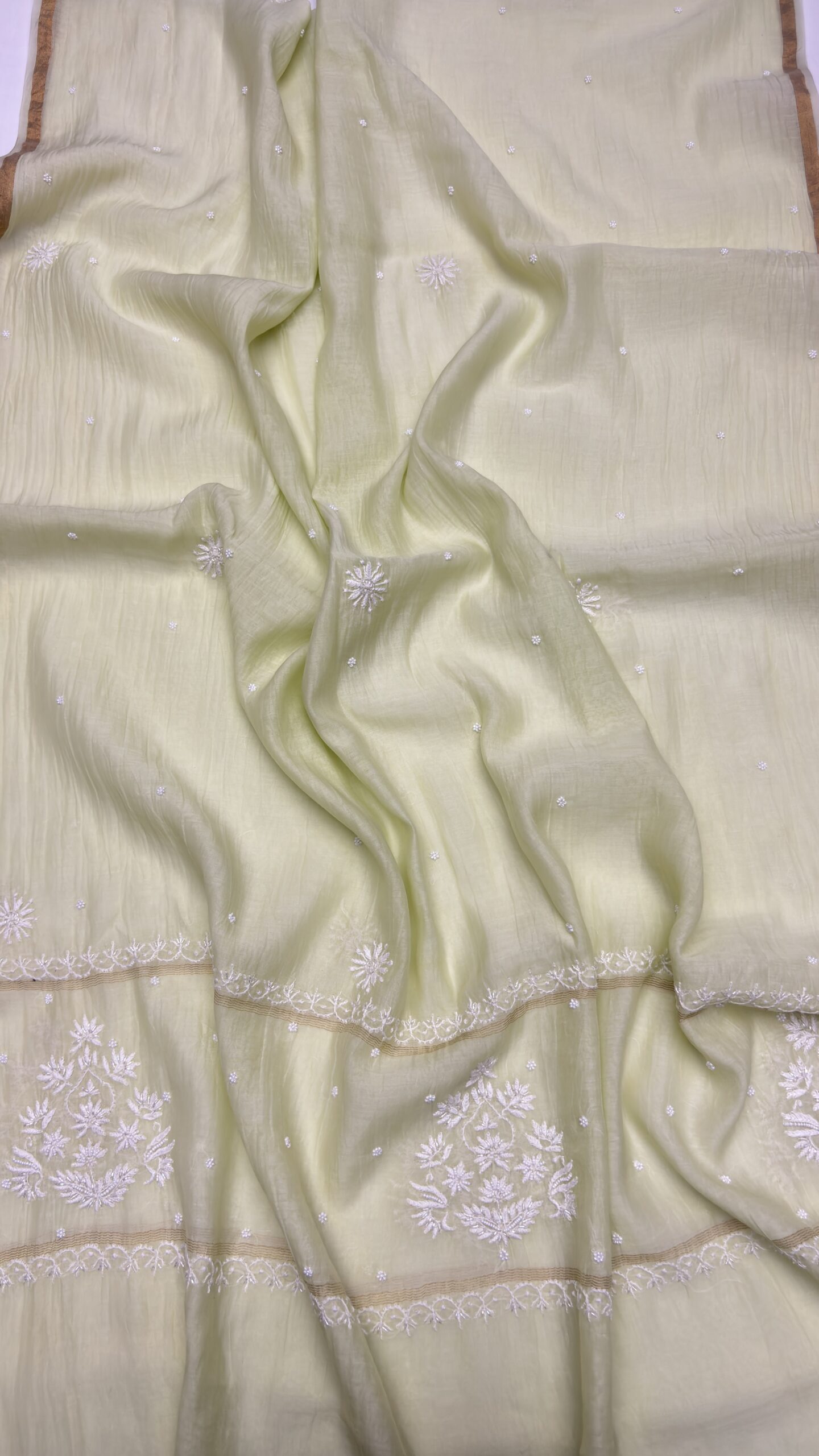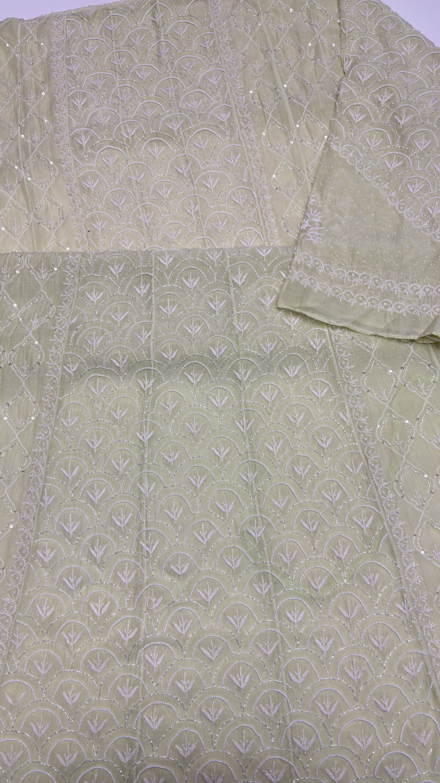Intricate hand-done Chikankari is beautifully highlighted with delicate sequins, cutdana, and poth embellishments.