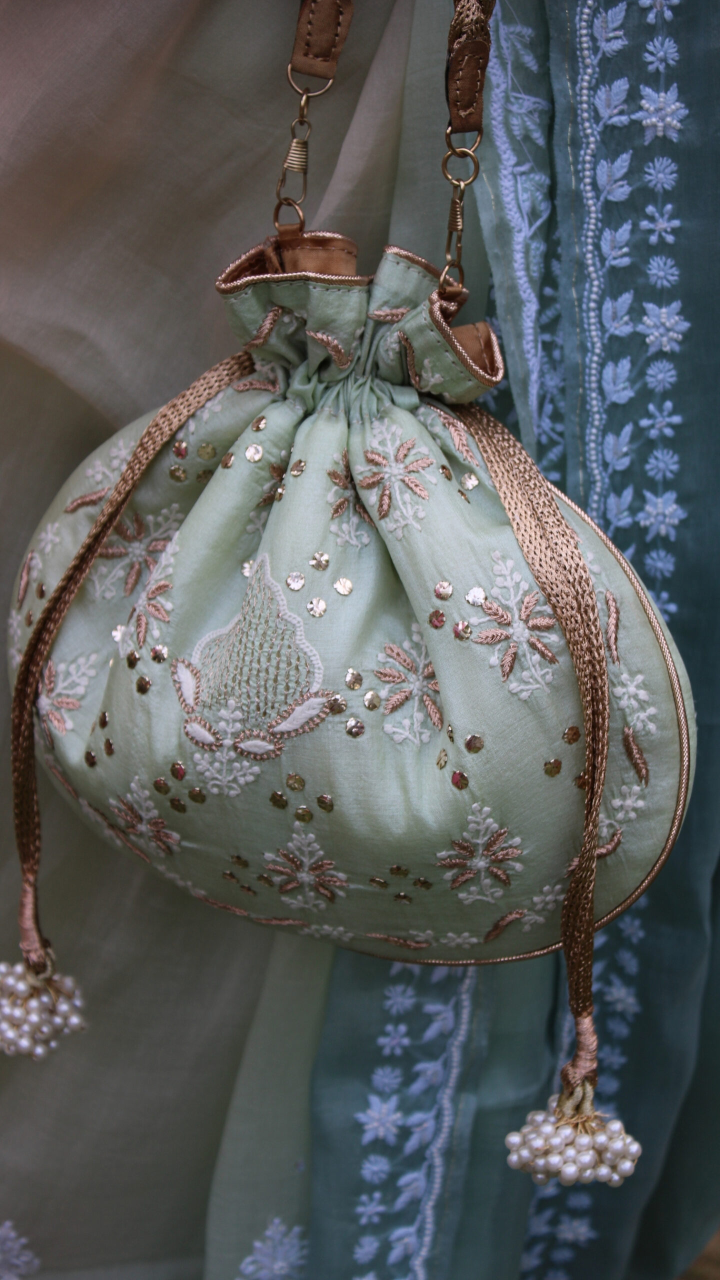 Refresh your look with this Mint Green Chikankari & Mukaish Batua, a perfect blend of elegance and tradition. Adorned with intricate Chikankari embroidery, it beautifully showcases the charm of Lucknowi craftsmanship. The delicate Mukaish work adds a subtle shimmer, enhancing the soothing mint green hue. Compact yet spacious, it is designed to carry your essentials with ease. Ideal for festive occasions, weddings, or day events, it complements both ethnic and fusion outfits effortlessly. A stylish and graceful accessory that also makes for a thoughtful gift.