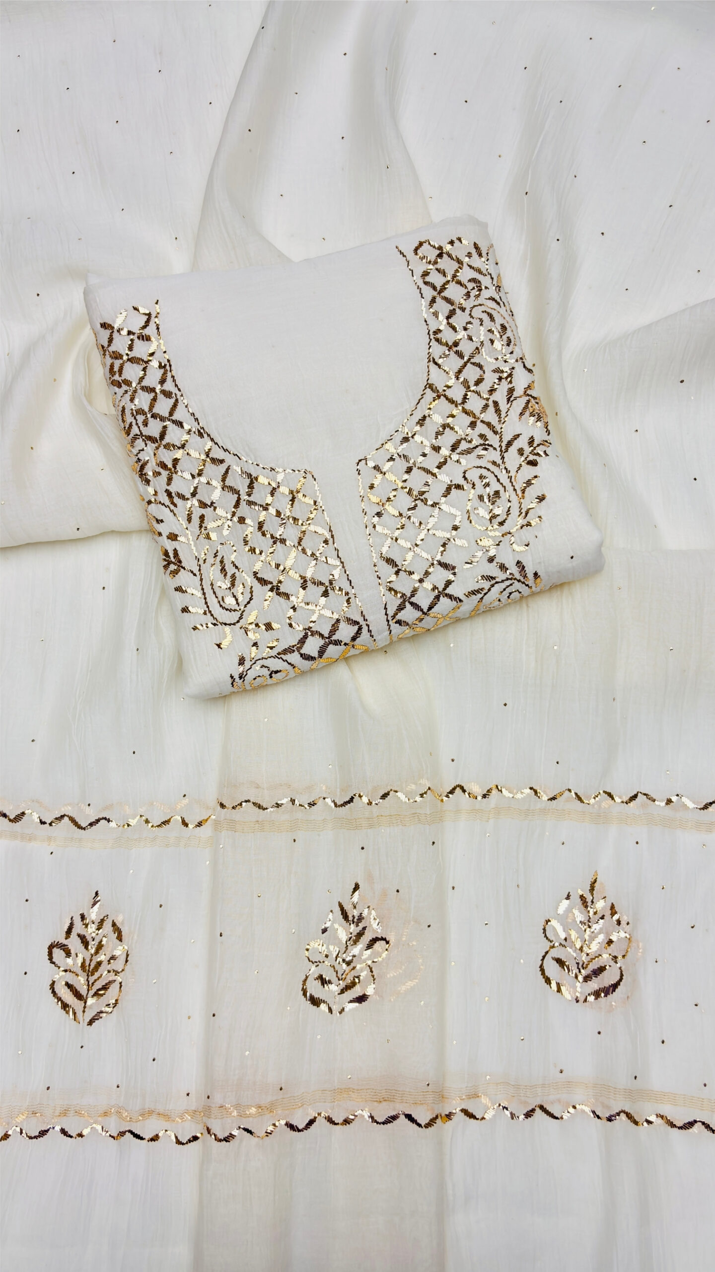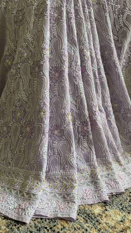 Soft and graceful, this peach pure premium georgette Chikankari saree is beautifully enhanced with delicate Mukaish work for a subtle shimmer. Crafted from lightweight, flowy fabric, it features intricate hand embroidery that reflects the elegance of traditional Lucknowi artistry. The soothing peach hue adds a fresh and feminine charm, perfect for festive and special occasions. Paired with a matching blouse piece, it offers both style and comfort. The elegant drape enhances your silhouette effortlessly. A perfect blend of classic craftsmanship and refined sparkle.