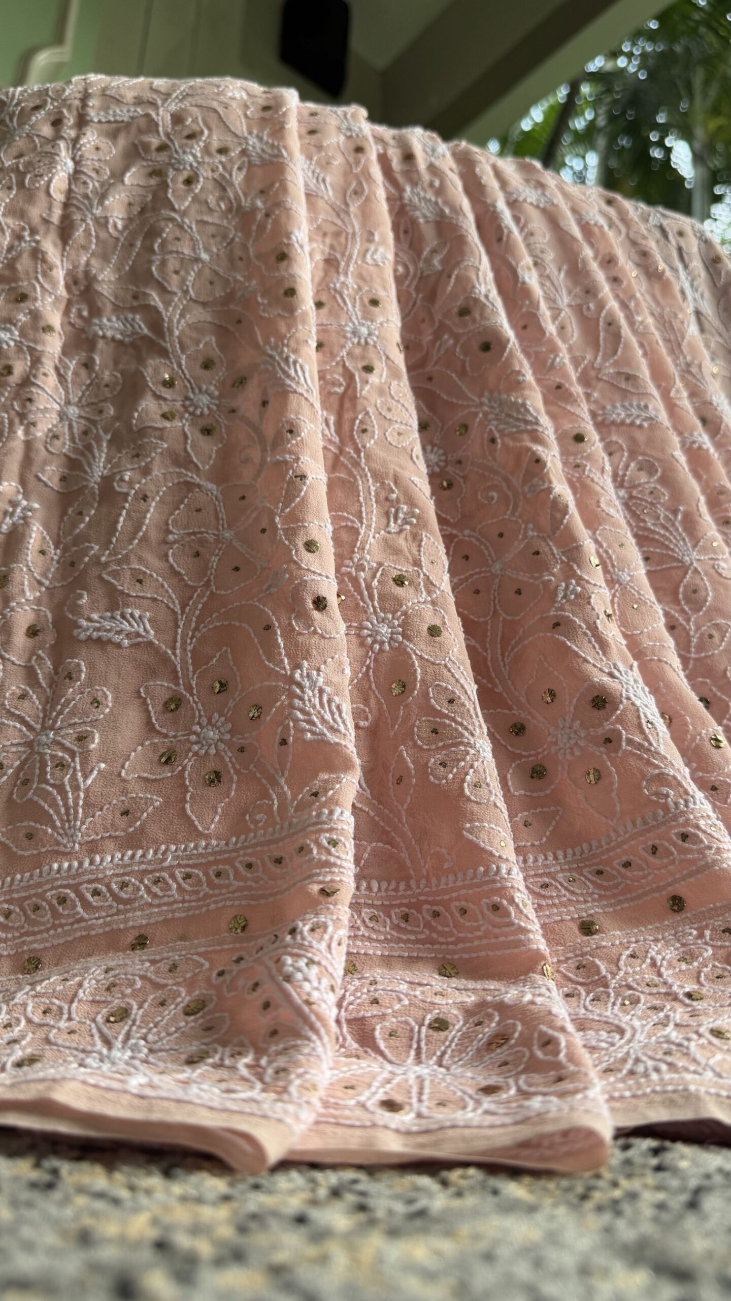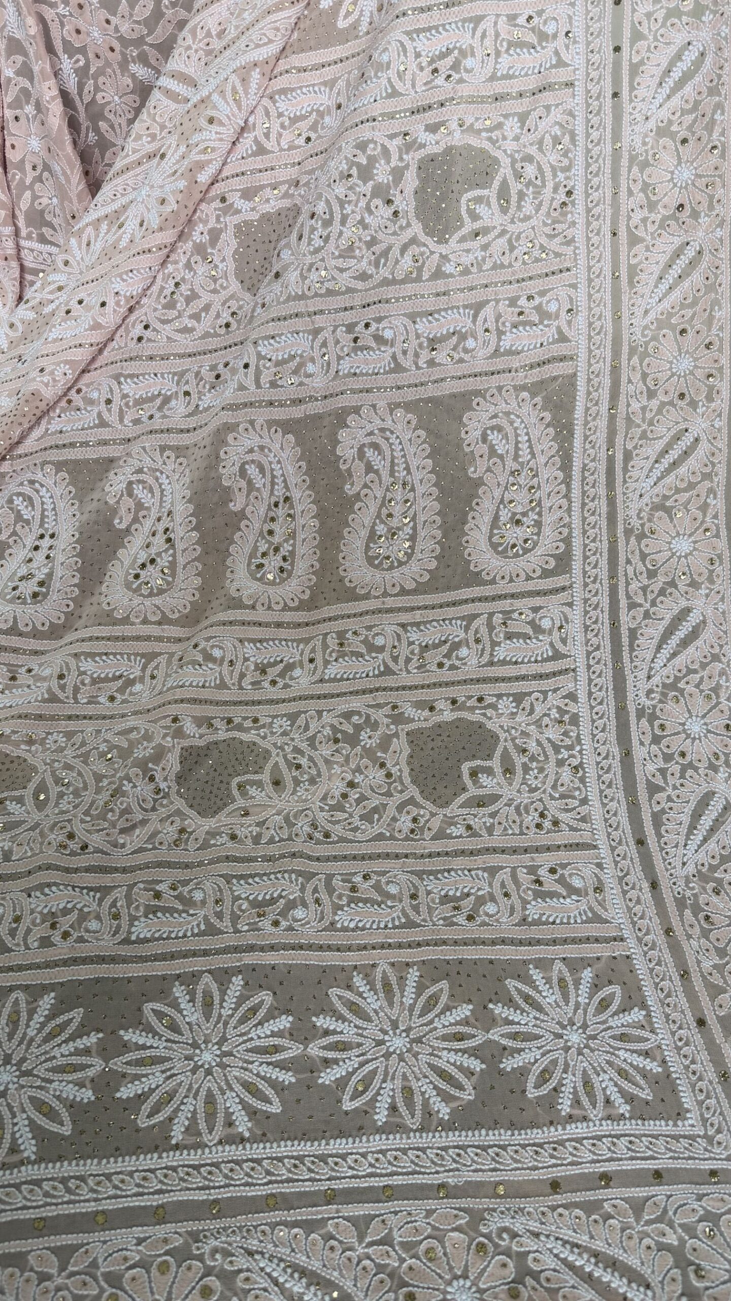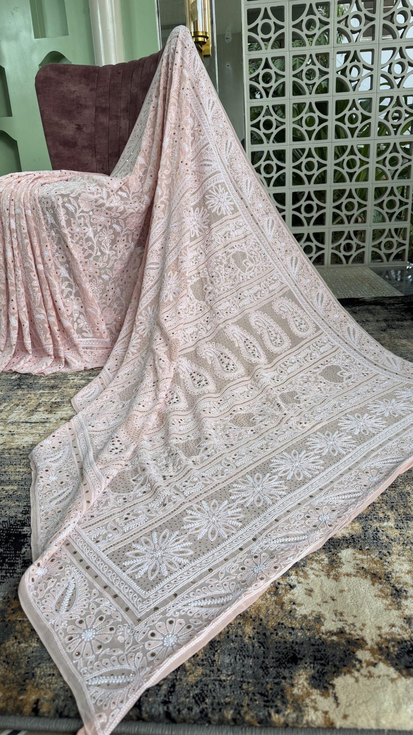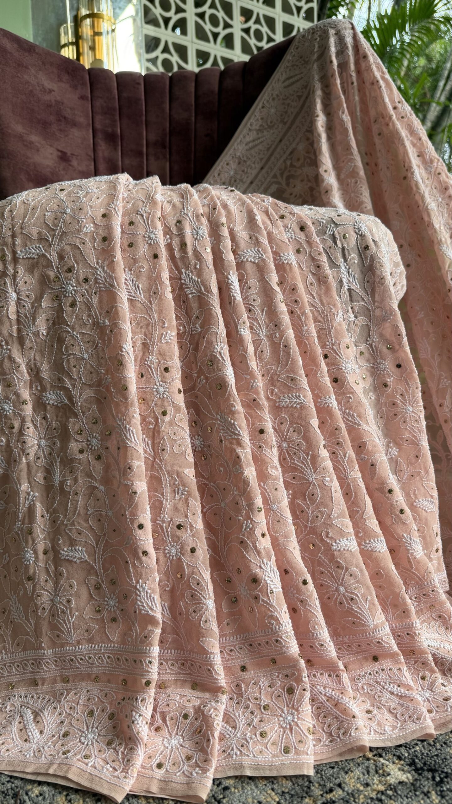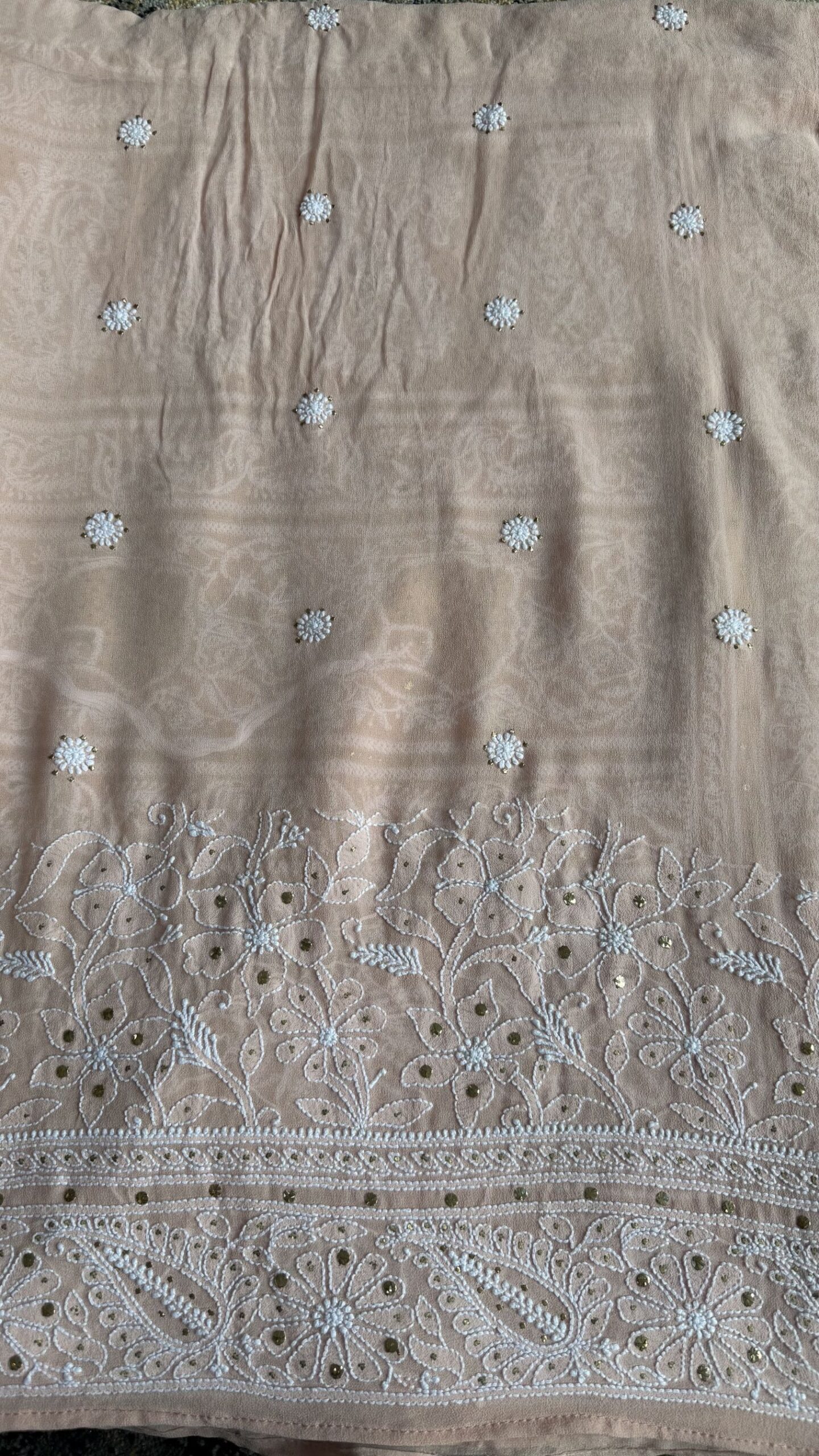 PEACH PURE & PREMIUM GEORGETTE CHIKANKARI & MUKAISH SAREE & BLOUSE