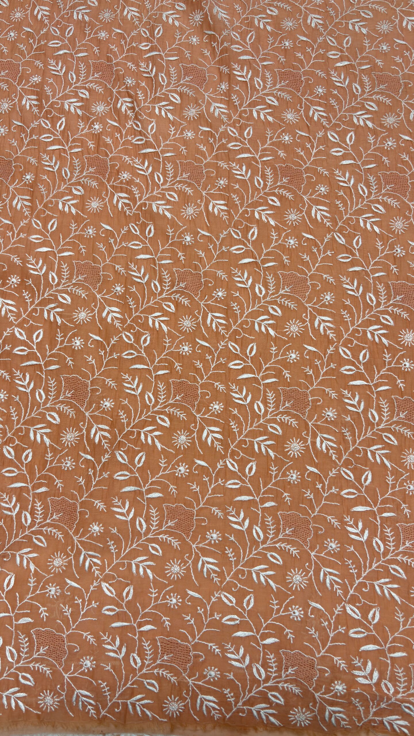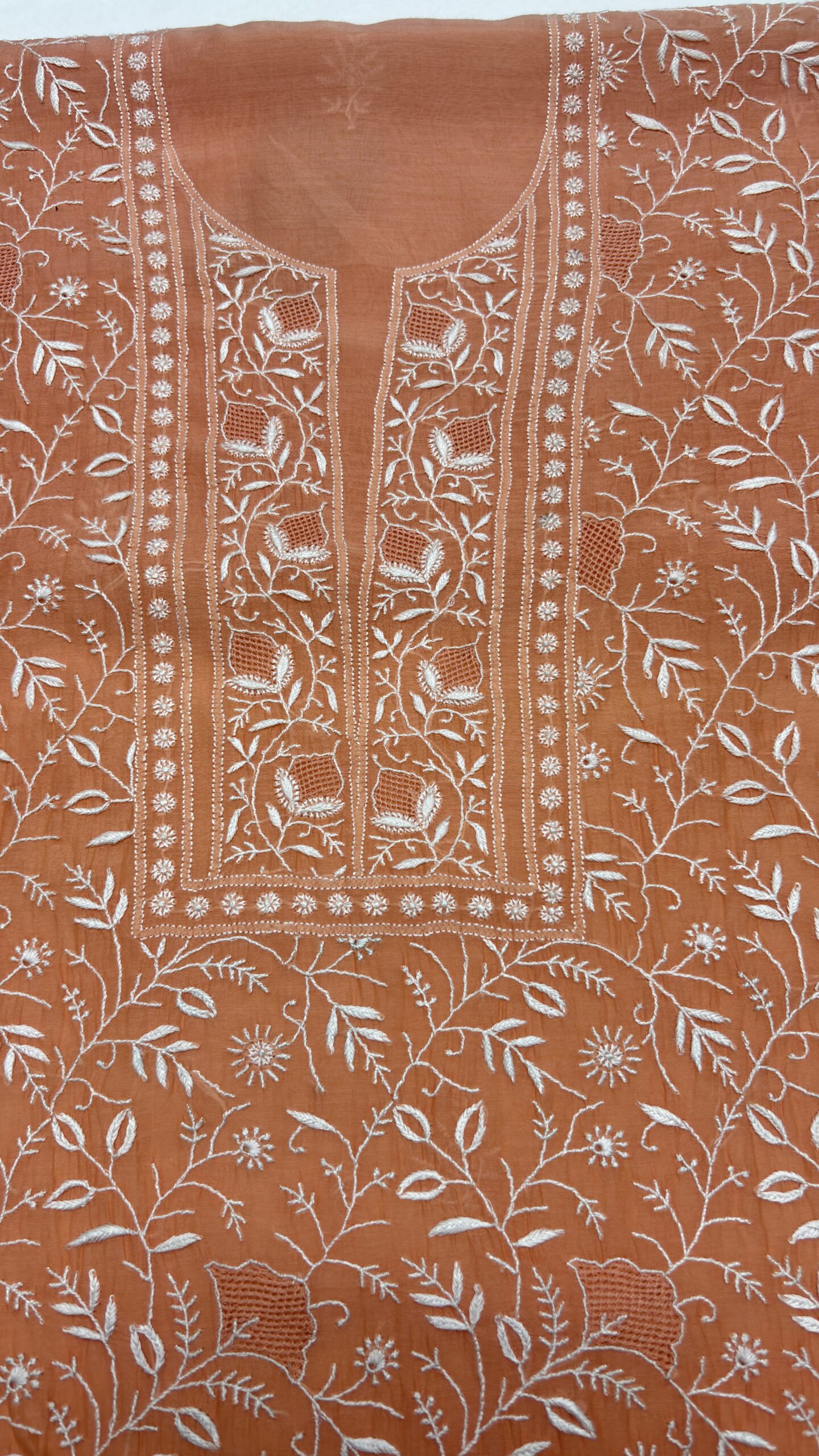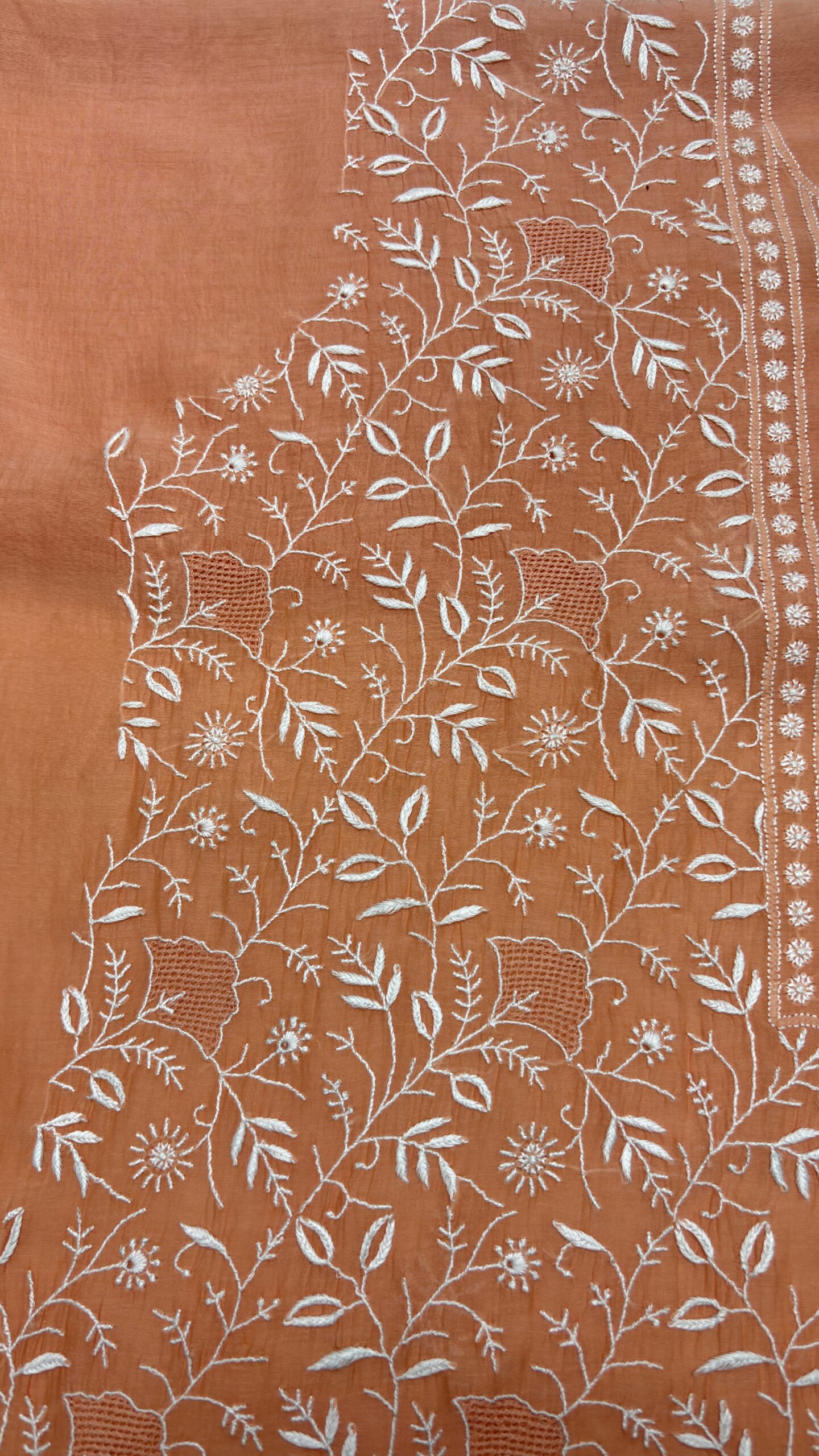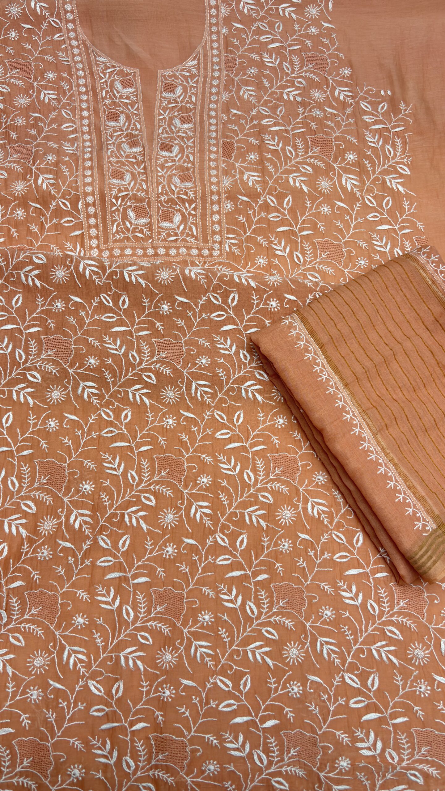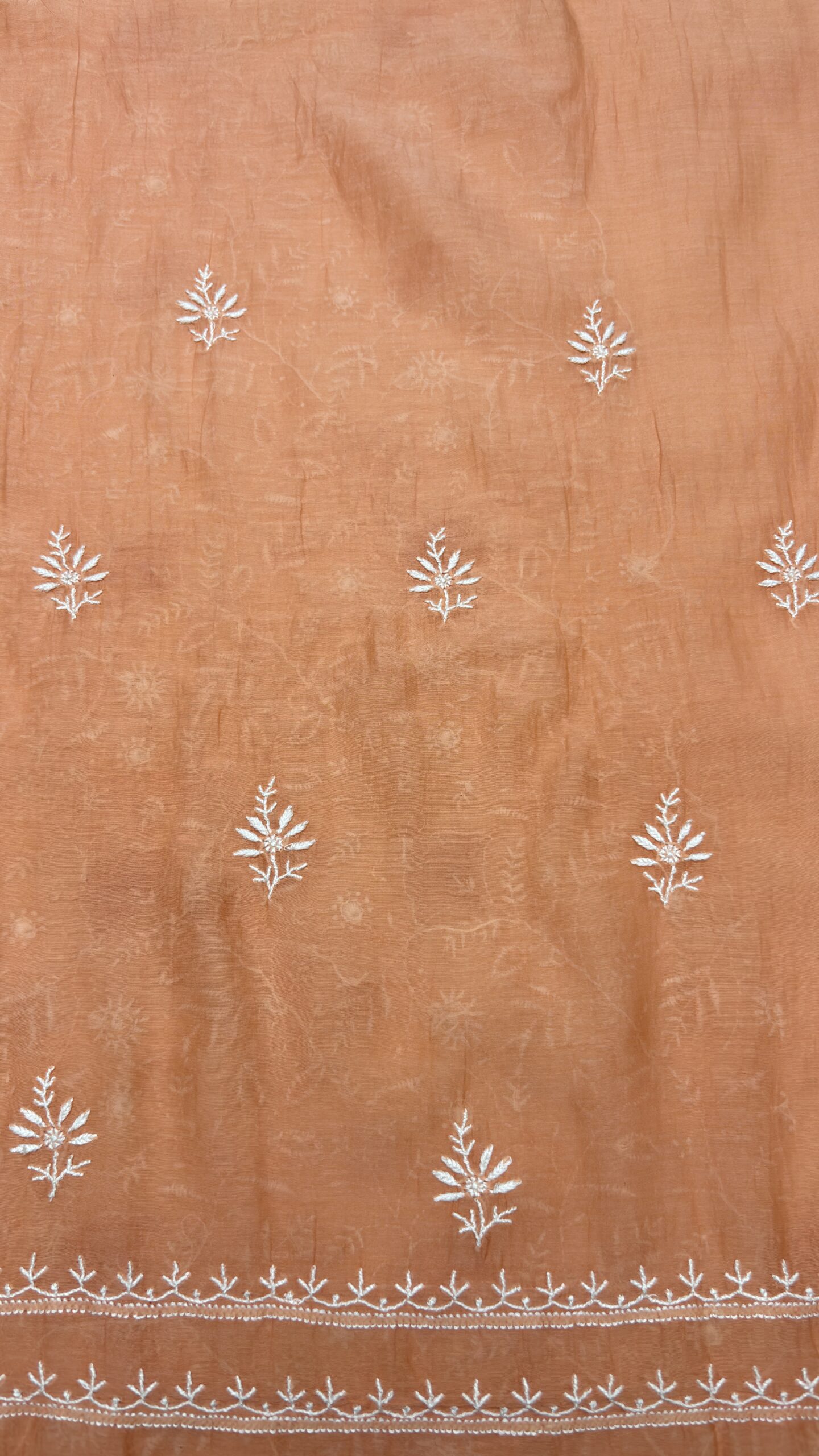 PEACHISH ORANGE CHANDERI MUL CHIKANKARI KURTA & DUPATTA FABRIC SET