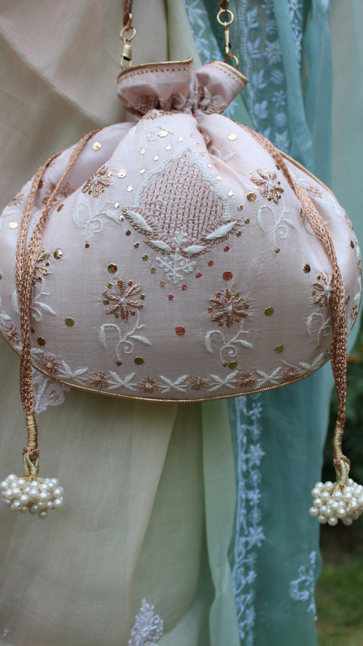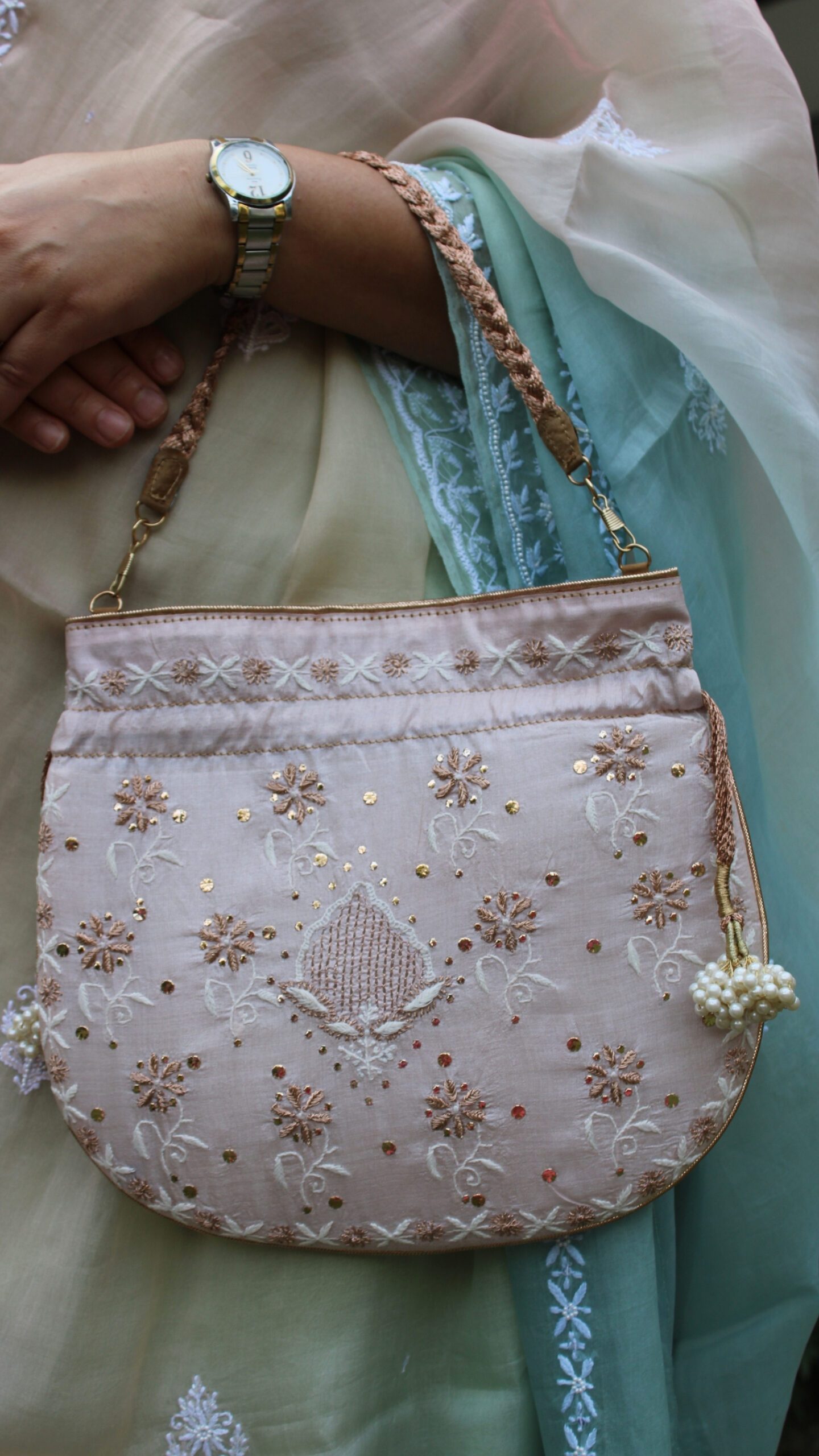 Add a touch of delicate charm to your look with this Soft Pink Chikankari & Mukaish Batua. Beautifully handcrafted with intricate Chikankari embroidery, it reflects the elegance of traditional Lucknowi artistry. The subtle Mukaish work lends a gentle shimmer, perfectly complementing the soft pink hue. Compact yet functional, it is ideal for carrying your daily essentials with ease. Perfect for festive occasions, weddings, or intimate gatherings, it enhances both ethnic and fusion outfits. A graceful accessory that also makes for a lovely gifting option.