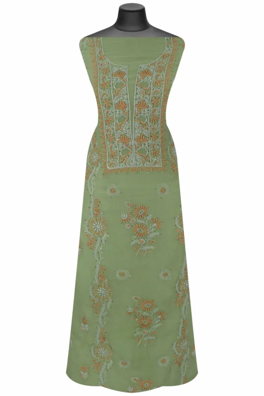 Srajann Hand Embroidered Green Chanderi Lucknow Chikankari Unstitched Kurta With Dupatta(SLC1304)