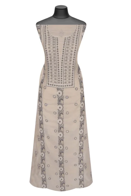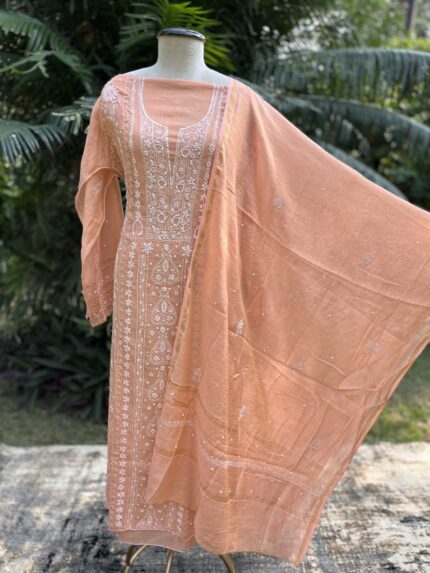 Srajann Hand Embroided Fawn Mul Chanderi Lucknowi Chikankari Unstitched Kurta Dupatta Set (SLC1852)