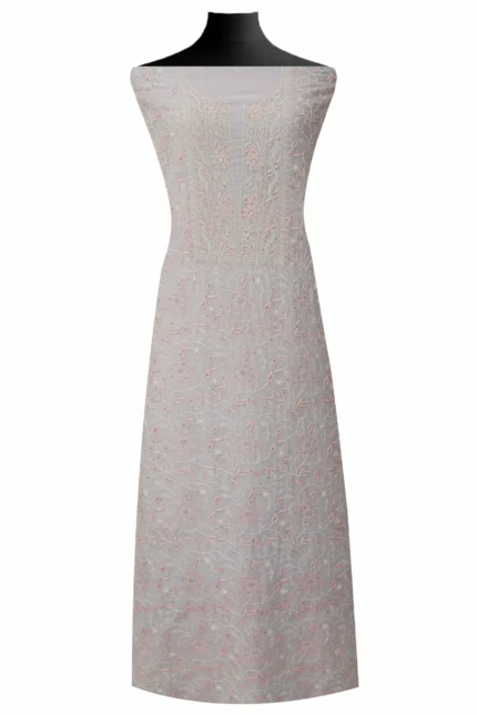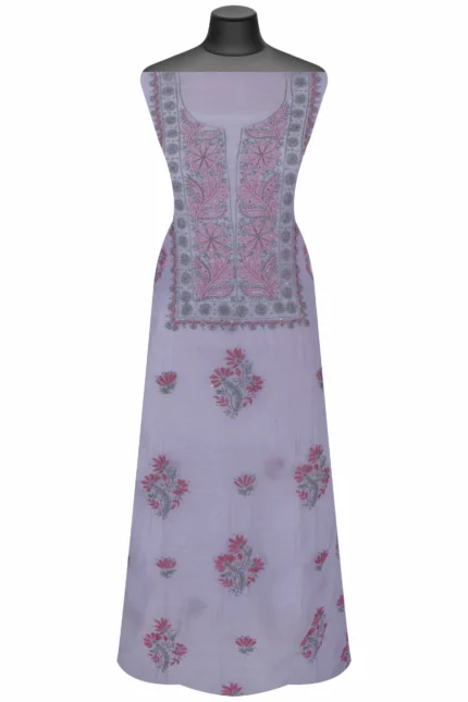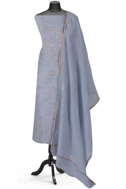 Exquisite Hand-Embroidered Grey Mul Chanderi Lucknowi Chikankari Unstitched Kurta Dupatta Set
